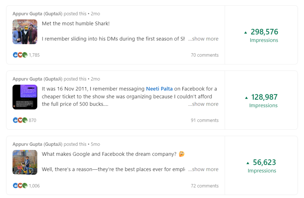 One of the biggest wins was his post about meeting Aman Gupta (co-founder of boAt). Instead of just saying, “I met Aman Gupta. He’s a great guy.”
